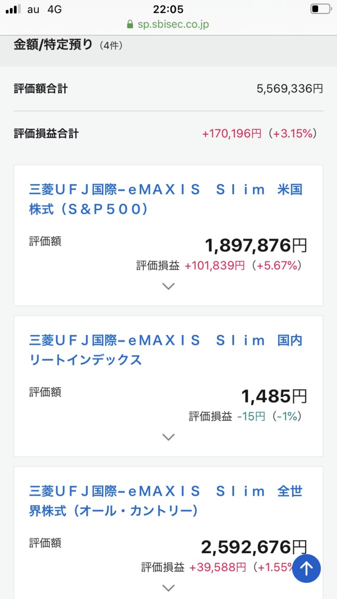 slimオールカントリー10000円、slim米国株式S&P500を5000円、slim先進国4000円、slim国内REIT500円を、毎日つみたてしています。