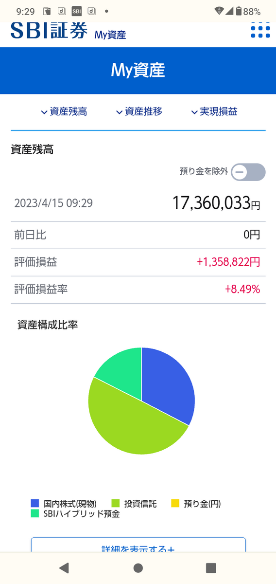 投資信託、個別株、待機資金の合計が1730万円くらいになっています。