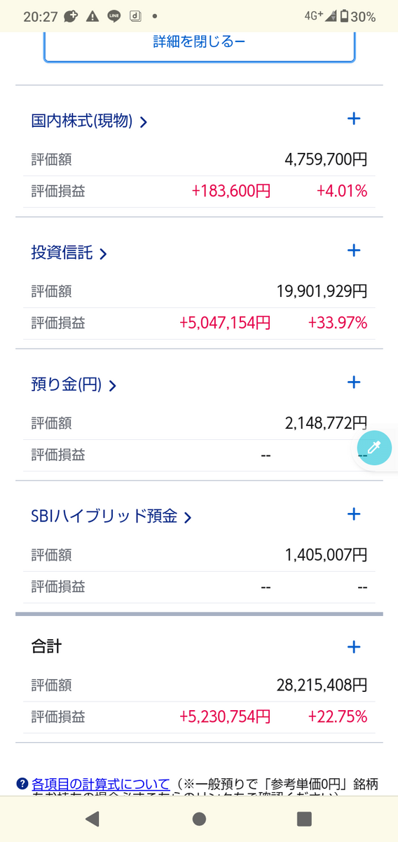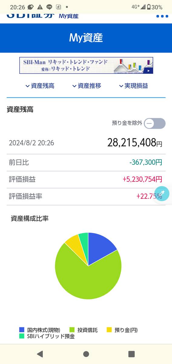金曜日ですが、現在のSBI証券のマイ資産の画面です。